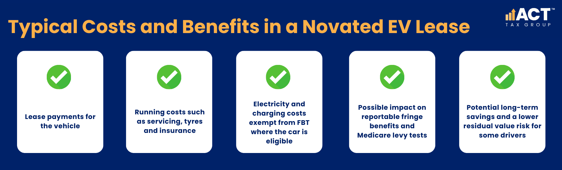 For an employee, the benefits often show up as easier access to a newer vehicle and better control over car expenses. Packaging car expenses through a novated lease and using an FBT exempt EV can provide tax savings compared to paying for all costs after tax. While some amounts may still be counted when working out taxable income for certain tests, the overall position is often more favourable than a non-exempt vehicle.