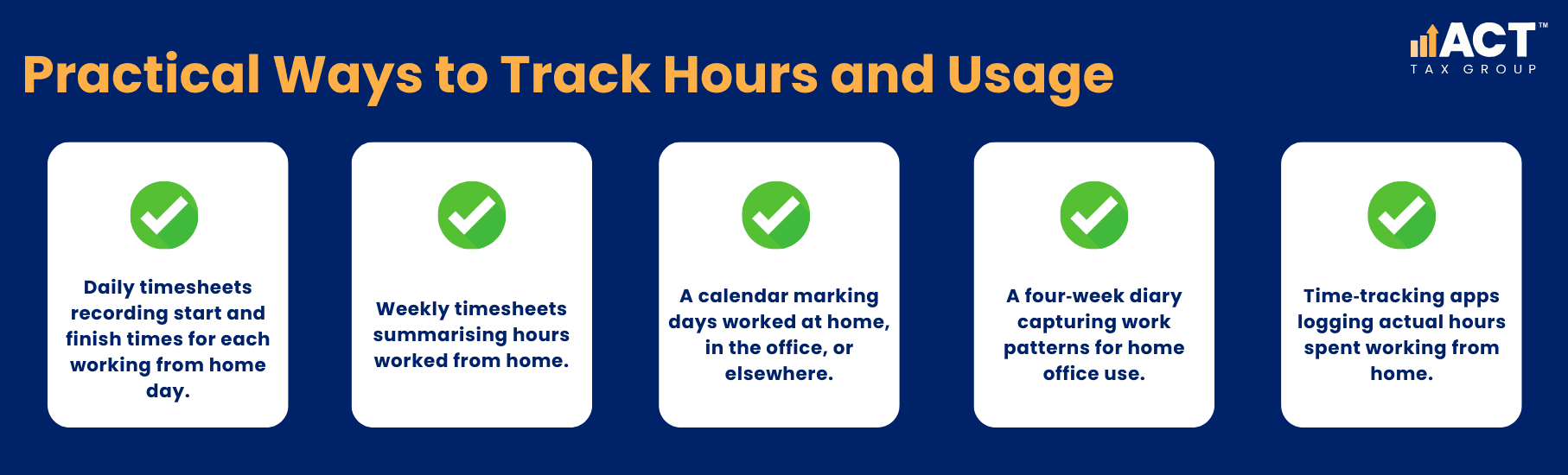 You might track work hour details using a calendar, spreadsheet, timesheet, or time‑tracking app. Many business owner clients use job management software, while employees may rely on employer timesheets or online log‑in reports. The key is that your records clearly show when you were working from your home office so your cents per hour claim is well supported.