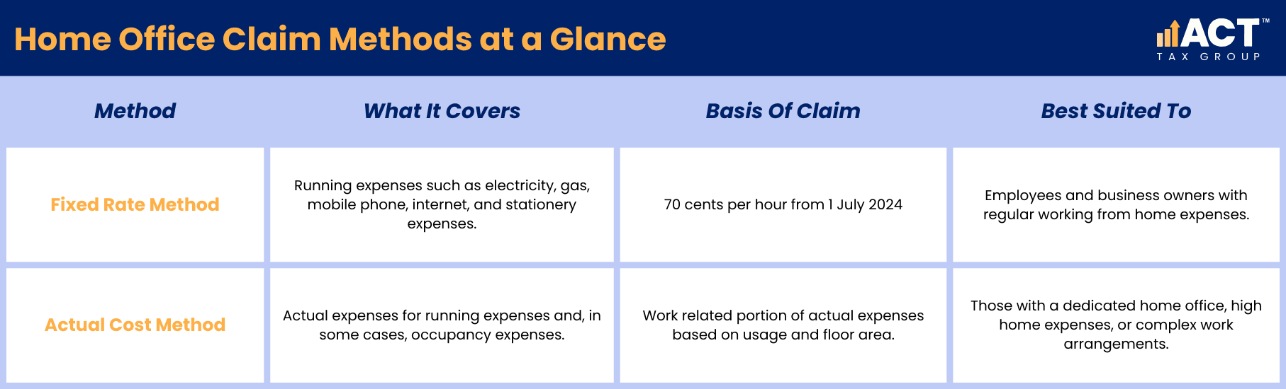 You generally choose between the fixed rate method and the actual cost method when claiming home office deductions. The fixed rate method uses a cents per hour approach for working from home expenses, while the actual cost method uses actual expenses and more detailed calculations. Both can be effective if they suit your personal circumstances and you follow the rules.