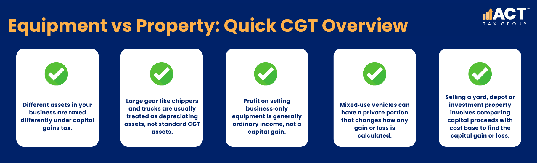 When you look at your business, you have a mix of assets: heavy gear, vehicles, and property. The way capital gains tax applies will vary depending on the type of asset, how it is owned, and how it has been used.