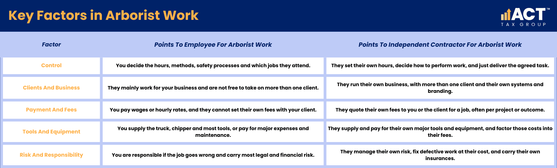 At ACT Tax Group, we work with arborists and other trades who engage both employees and subcontractors, helping them determine when a worker is an employee or contractor, set up clear contracts, and build payroll costs into their pricing. We focus on practical systems that reflect the real substance of the relationship, manage risk and keep you on the right side of the rules while you grow your business.