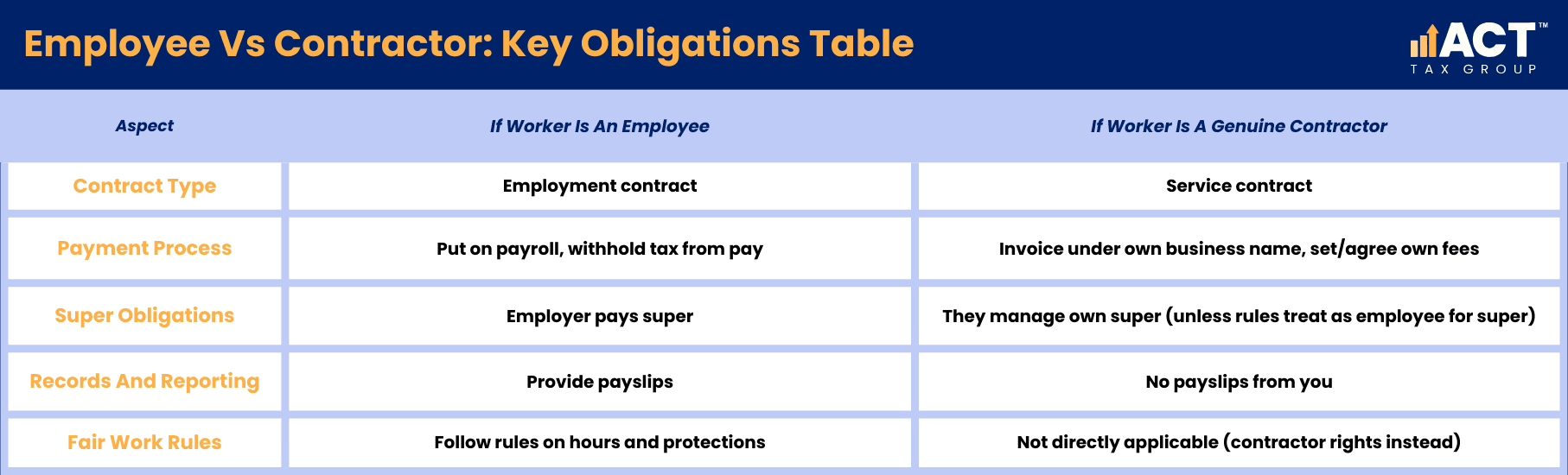 When most of these factors point to you having control and responsibility, it is likely that the worker is an employee, even if the contract calls them a contractor. When most factors show the person running their own business, managing their own risk and setting their own hours, they are generally closer to an independent contractor.