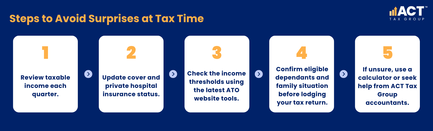 ACT Tax Group is here to help you get your income, hospital cover, deductions, and levy right—so you stay in control, pay the correct amount, and spend less time worrying about calculations. If you’re uncertain about any benefit, liability, or exemption, our accountants keep the process straightforward.