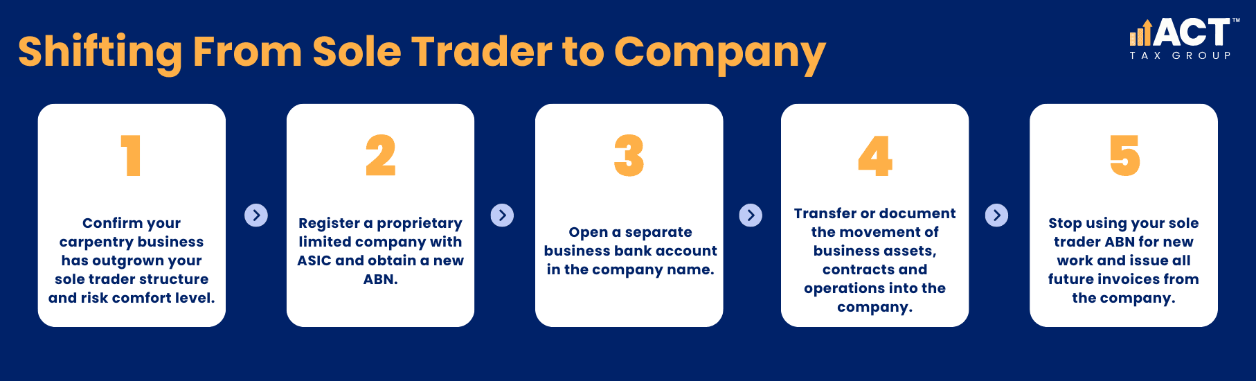 When you change structure, you don’t lose everything you’ve built. You can transfer your existing carpentry work into the company, use the same business name (with the right registrations), and keep trading—just under a different legal entity, with a separate business tax return and clearer lines between business and personal money. The transition itself is straightforward: incorporate with ASIC, get a new ABN for the company, set up a company bank account, and formally transfer or document the shift of your business assets. Your old sole trader ABN stays registered but stops being used for new work; all future invoices come from the company.