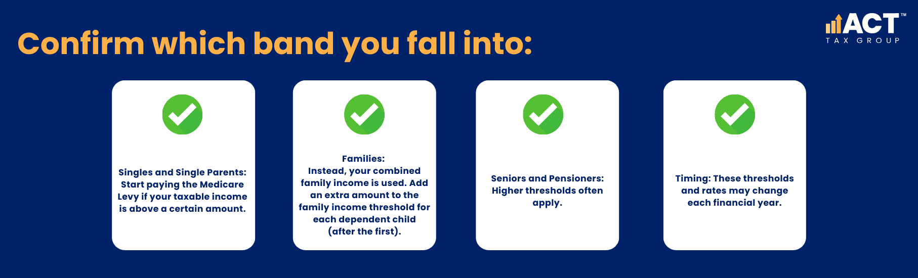Visit the ATO website’s Medicare Levy page and review the latest thresholds.
