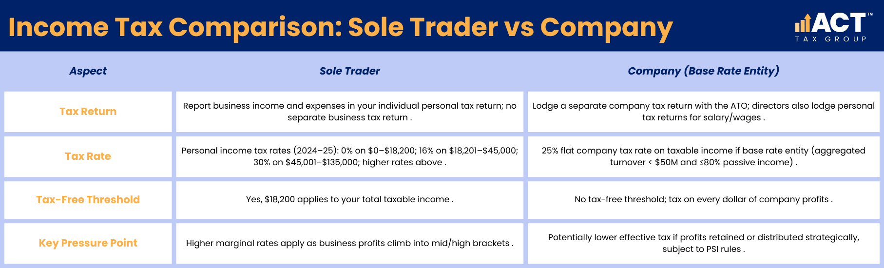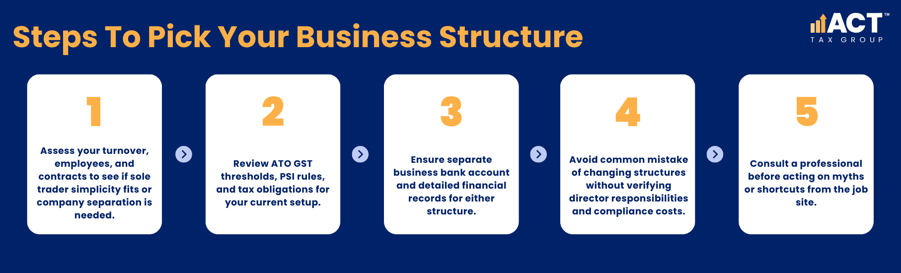 This article is general in nature, for illustration only and does not constitute financial or personal advice. For ATO-compliant support that looks at your actual turnover, risk profile, and growth plans, book a consult with ACT Tax Group before you make any structure changes or sign major contracts.