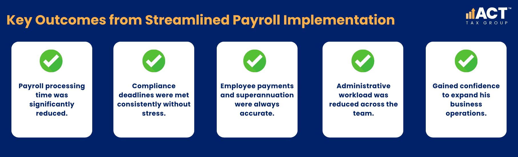 Understanding Sam’s situation, our team at ACT Tax Group worked with him to implement simplified payroll services that would handle his growing compliance obligations without overwhelming his daily focus on electrical work.