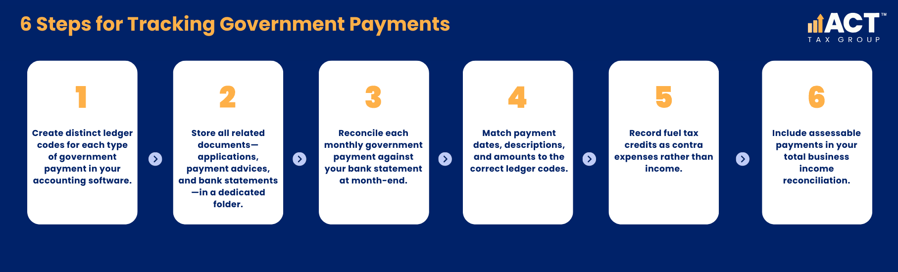 Government payments often arrive as monthly payments. Reconcile these against your bank statements at month-end. Match the date, description, and amount to the ledger code. For fuel tax credits, reconcile the credit against the fuel expense code. For payments that boost gross income, include them in your reconciliation of total business income.