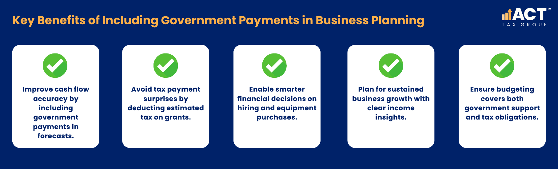 When building cash flow forecasts, include expected government grants and subsidies alongside revenue from contracts. Then deduct estimated tax on those payments and forecast the remaining available cash. This approach helps you avoid cash shortages when tax instalments come due and ensures you can budget for new tools, vehicles, or wage costs without surprises.