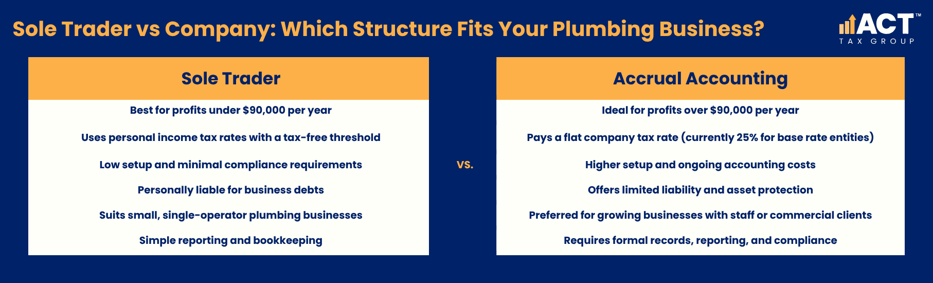 Company structures become advantageous when your plumbing business consistently generates profits over $90,000 annually. The flat company tax rate provides significant savings compared to progressive personal income tax rates that can reach 45% plus Medicare levy.