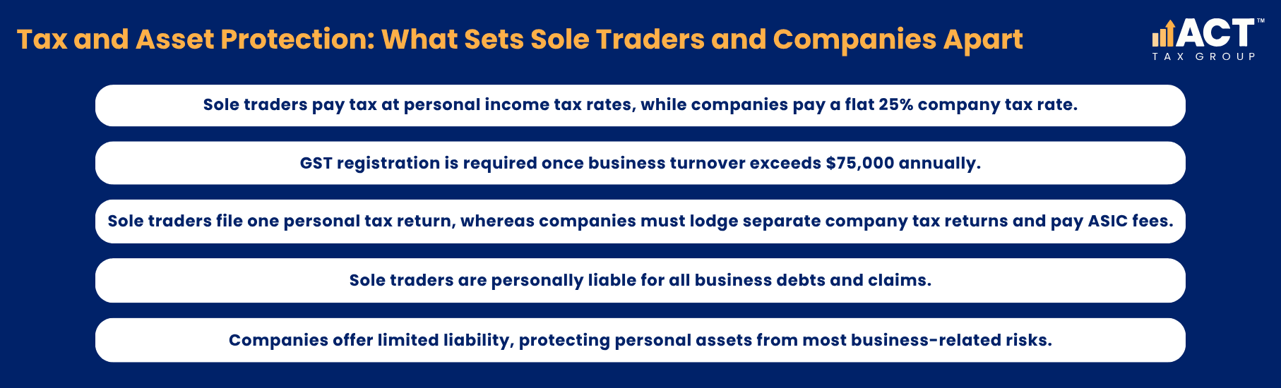 The administrative load differs significantly between structures. Sole traders handle their tax obligations through a single personal tax return that includes business income and deductions. Companies must lodge separate annual company tax returns, maintain minutes of meetings, and comply with various corporate governance requirements.