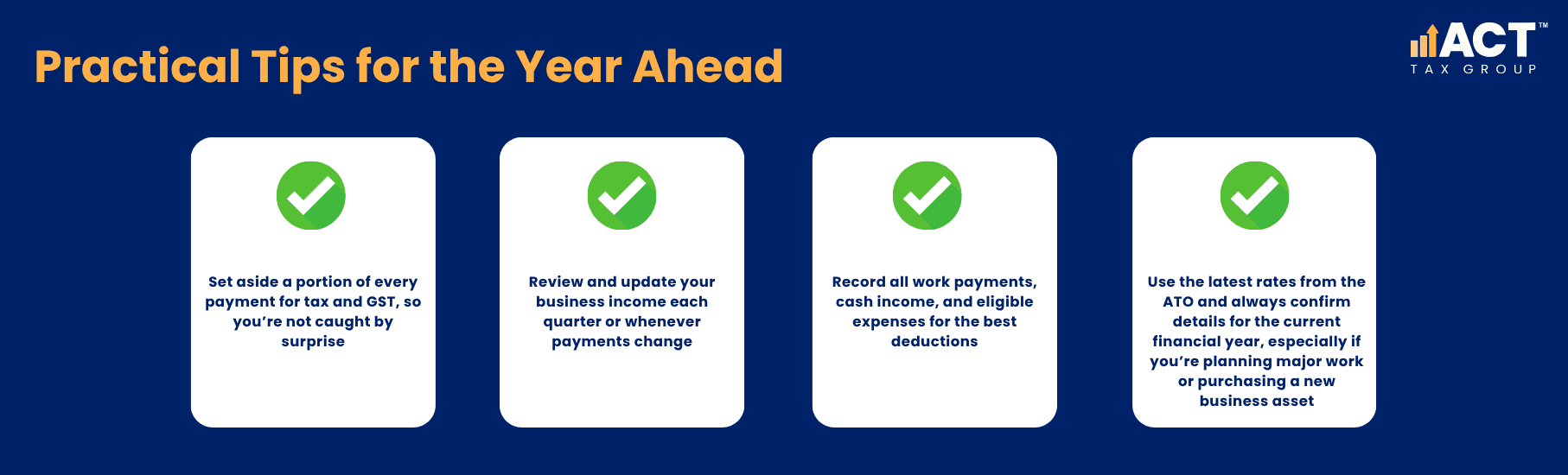 ATO support and information are always available—check the ATO website for more help, updates on resident tax rates, deductible business expenses, and guidance on how your payments are calculated.